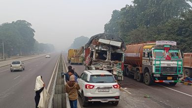 बीच राष्ट्रीय राजमार्ग पर खड़ी कंटेनर से आलू लदी ट्रक टकराई