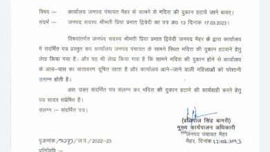 मैहड़ कटनी रोड़ स्थित मदिरा दुकान विस्थापित किए जाने के संबंध में मुख्य कार्यपालन अधिकारी जनपद ने कलेक्टर को लिखा पत्र
