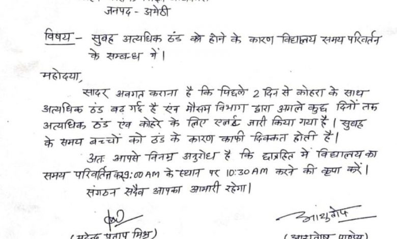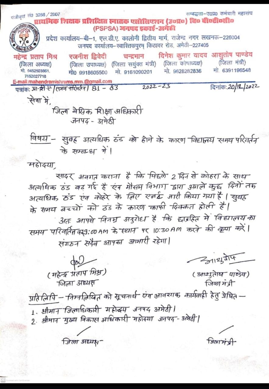 अमेठी। सुबह अत्यधिक ठंड को होने के कारण विद्यालय समय परिवर्तन की मांग प्राथमिक शिक्षक प्रशिक्षित स्नातक एसोसिएशन अमेठी के जिलाध्यक्ष महेंद्र प्रताप मिश्र ने उठाई तथा जिला बेसिक शिक्षा अधिकारी अमेठी को ज्ञापन सौंपा।