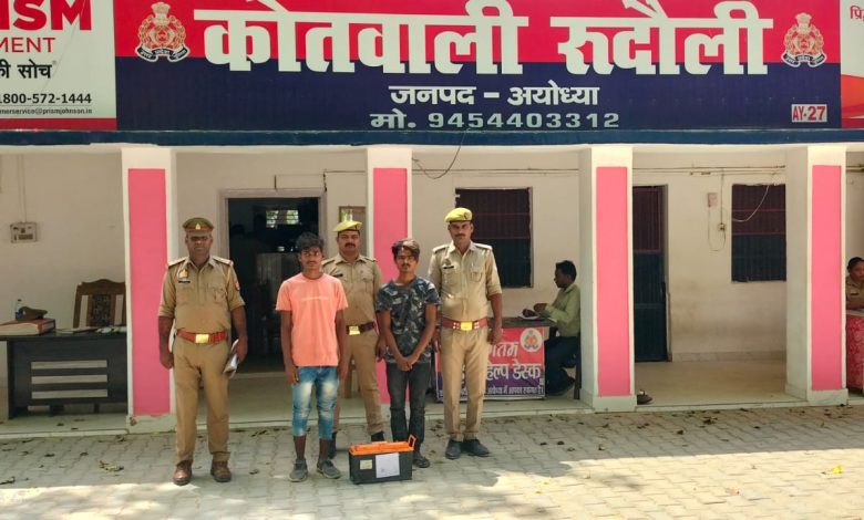 2.हे0का0 सन्तोष गुप्ता को0 रूदौली अयोध्या 3.का0 संदीप यादव को0 रूदौली अयोध्या मय पुलिस बल द्वारा थाना स्थानीय पर पंजीकृत मु0अ0सं0 281/2023 धारा 379/411 आईपीसी से सम्बन्धित अभियुक्त 1.संजय पुत्र सुन्दर नि0 मीसा थाना को0 रुदौली जनपद अयोध्या 2.गुलशन पुत्र स्व0 दयाराम कोरी नि0 मीसा थाना को0 रुदौली जनपद अयोध्या को एक अदद चोरी के बैट्री पावर जोन(POWER JONE) के साथ शिवचरन पुरवा मोड़ से पहले गिरफ्तार करने में सफलता प्राप्त हुई। जिसके सम्बन्ध में पंजीकृत है। रिपोर्ट धीरेन्द्र मिश्रा