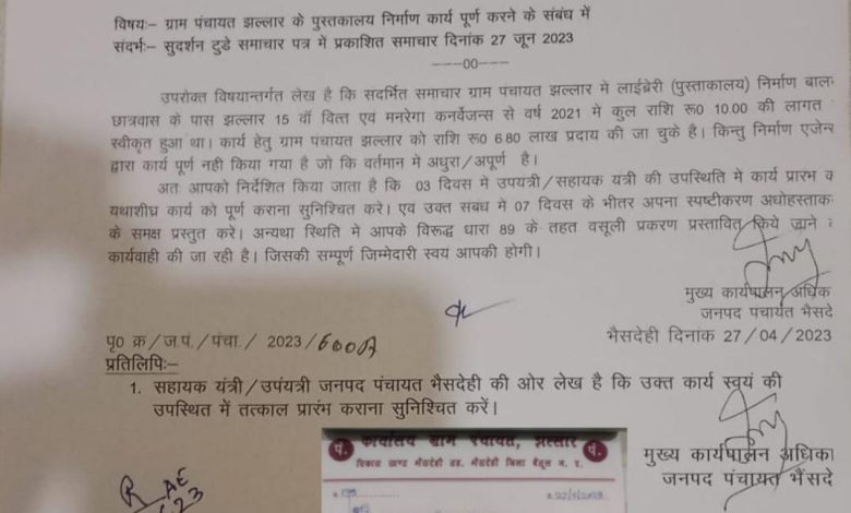जनपद पंचायत भैंसदेही सीईओ के मार्गदर्शन में ग्राम पंचायत झल्लार एजेंसी को कारण बताओ नेटिस 27/06/2023 को जारी कर संदर्भित समाचार का उल्लेख करते हुवे बताया कि ग्राम पंचायत झल्लार में लाईब्रेरी (पुस्ताकालय) निर्माण बाल छात्रवास के पास झल्लार 15 वॉ वित्त एवं मनरेगा कनर्वेजन्स से वर्ष 2021 में कुल राशि 10.00 लाख की लागत स्वीकृत हुआ था। कार्य हेतु ग्राम पंचायत झल्लार को राशि 6लाख 80 हजार प्रदाय की जा चुके है। किन्तु निर्माण एजेंसी द्वारा कार्य पूर्ण नही किया गया है जो कि वर्तमान में अधुरा / अपूर्ण है।अतः आपको निर्देशित किया जाता है कि 03 दिवस में उपयंत्री / सहायक यंत्री की उपस्थिति में कार्य प्रारंभ कर यथाशीघ्र कार्य को पूर्ण कराना सुनिश्चित करें । एवं उक्त संबध में 07 दिवस के भीतर अपना स्पष्टीकरण अधोहस्ताक के समक्ष प्रस्तुत करें। अन्यथा स्थिति में आपके विरूद्ध धारा 89 के तहत वसूली प्रकरण प्रस्तावित किये जाने कार्यवाही की जा रही है। जिसकी सम्पूर्ण जिम्मेदारी स्वयं आपकी होगी ।