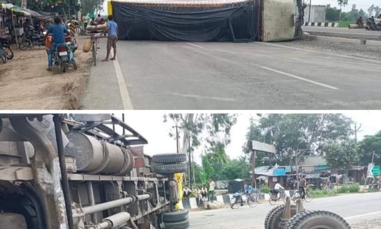 चाय की पत्ती लेकर दिल्ली जा रहा कंटेनर स्टेरिंग फेल होने के चलते हाईवे पर पलटा
