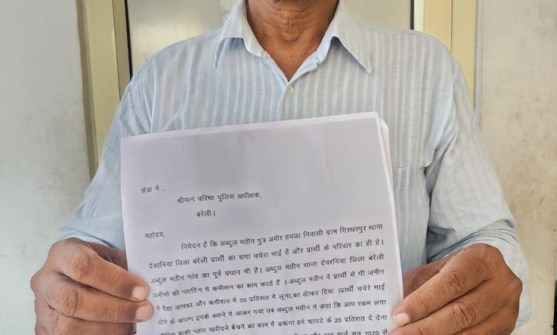 देवरनियां । एस एस पी के आदेश पर गांव गिरधरपुरा निवासी ताहिर अली ने वताया कि गांव के पूर्व प्रधान अब्दुल मतीन उनके चचेरे भाई है,जो देवरनियां में जमीनों की प्लाटिंग में कमीशन का काम करते हैं। आरोप है, अब्दुल मतीन ने ताहिर अली की रकम प्लाटिंग के काम में लगवा दिया और 25% कमीशन का भी लालच दिया।