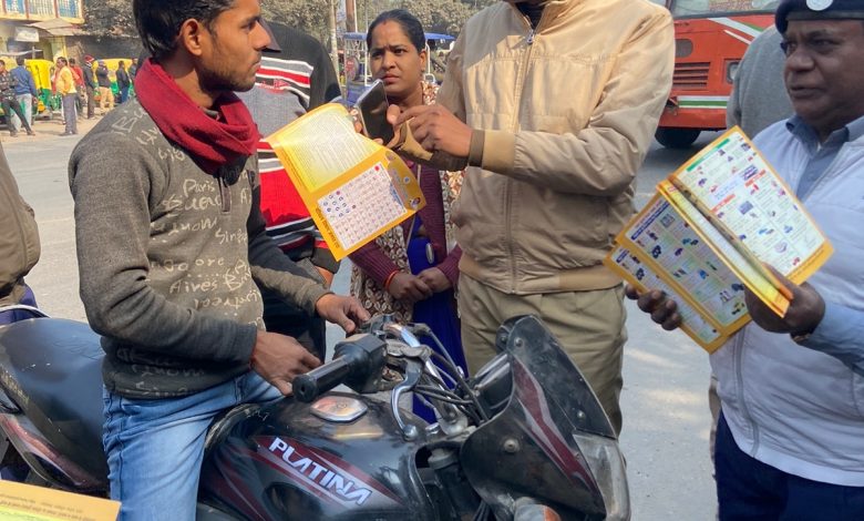 मोटरसाइकिल पर तीन सवारी बिना हेलमेट चल रहे लोगों को बताएं नियम,