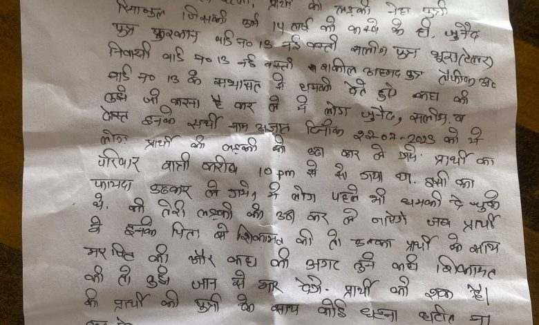 पीडित ने अपनी बेटी के साथ अनहोनी की आशंका जाहिर करते हुए आरोपी जुनैद, पुत्र फुरक़ान ,सलीम, पुत्र भुरा टेलर ,शकील अहमद पुत्र तोफ़िक़ अहमद शातिर किस्म का बताते हुए कार्रवाई की मांग की है।