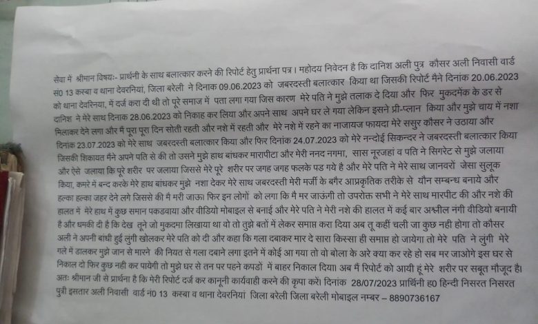 देवरनियां। सामूहिक दुष्कर्म के मुख्य आरोपी द्वारा पीडिता के साथ निकाह कर उसे घर लाकर यातनाएँ देने और ससुर और नंदोई द्वारा दुष्कर्म करने के मामले मे पांच के खिलाफ रिपोर्ट दर्ज की गयी है। पीडिता को उसके पहले पति ने सामूहिक दुष्कर्म के बाद तलाक दे दिया था।