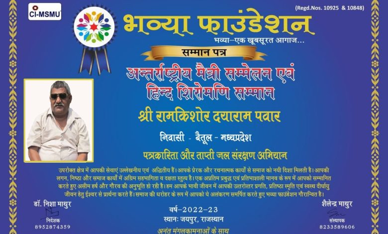 बैतूल से रामकिशोर पंवार को ताप्ती जल संरक्षण के लिए दिया जाएगा सम्मान भव्या फाउंडेशन का सम्मान समारोह जयपुर में संपन्न होगा