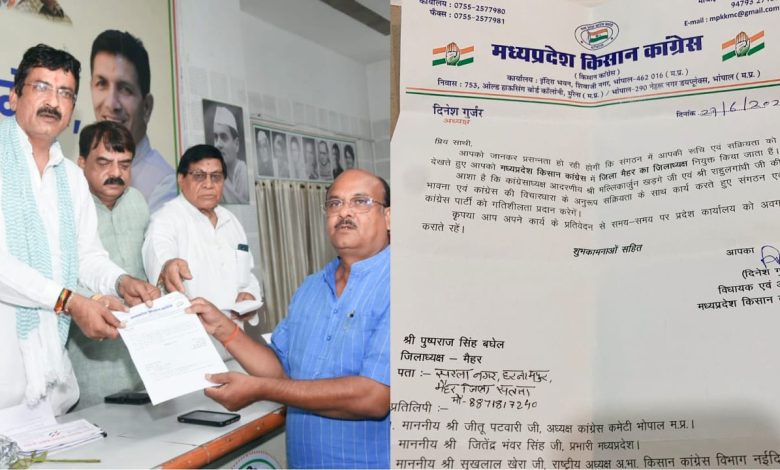 वरिष्ठ कांग्रेस नेता पुष्पराज सिंह बघेल को मैहर जिला किसान कांग्रेस का जिला अध्यक्ष नियुक्त किया गया