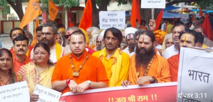 पूरा मामला चित्रकूट का है जहां बांग्लादेश में हो रहे हिंदुओं के उत्पीड़न तथा अत्याचार के संबंध में चित्रकूट से सभी मठ मंदिरों के साधु संत और महंत तथा सभी संगठनों ने विरोध प्रदर्शन किया शांतिपूर्ण ढंग से और पैदल मार्च निकालकर जिला अधिकारी चित्रकूट को राष्ट्रपति के नाम सोपे ज्ञापन उनकी मांग है कि बांग्लादेश में जो हिंदुओं के ऊपर हो रहे अत्याचार के खिलाफ भारत सरकार दखल दे और उनकी रक्षा करें बांग्लादेश सरकार के ऊपर दबाव बनाएं ताकि उनकी रक्षा हेतु कुछ अच्छे कदम उठाए जाए और आपको बता दें कि डॉक्टर रामनारायण त्रिपाठी संचालक गायत्री शक्तिपीठ रामचंद्र दास तुलसी पीठ अधिकारी डॉक्टर मदन गोपाल दास अधिकारी कामतानाथ प्रमुख द्वार दिव्या जीवन दास महंत भारत मंदिर दीपक तिवारी महंत मत्त गेयेनद नाथ स्वामी मुन्ना महाराज महंत पण कुटी अतुल सिंह राजेंद्र त्रिवेदी अध्यक्ष विहिप शैलेंद्र सिंह भदोरिया बजरंग दल आपको बता दें डॉक्टर मदन गोपाल जी ने सरकार से मांग की है या तो बांग्लादेशी हिंदुओं की रक्षा हो नहीं तो हमें बांग्लादेश जाने का आदेश करें सरकार हम सभी साधु संत लोग आदि सभी समुदाय के संत जाकर बांग्लादेश हिंदुओं के रक्षा आन बान शान की हम अपनी जान देकर भी उनकी रक्षा करेंगे उनकी बहू बेटियों की आबरू की रक्षा करेंगे चाहे हमें अपने प्राण ही क्यों न देने पड़े हम राष्ट्रपति महोदया से यही अपील करते हैं