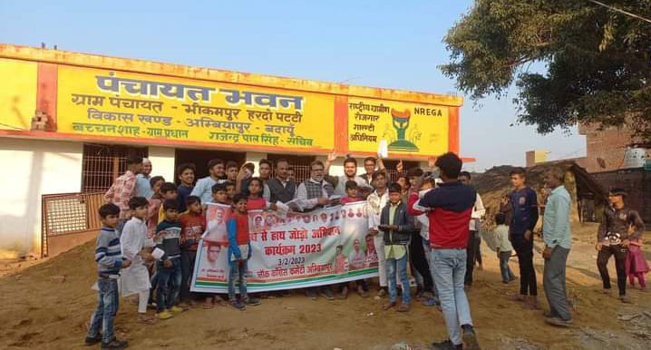 अखिल भारतीय कांग्रेस कमेटी के आवाहन पर आज बिल्सी विधानसभा क्षेत्र के ब्लॉक अम्बियापुर के गांव भीकमपुर में कांग्रेस जनों ने हाथ से हाथ जोड़ो कार्यक्रम के अनुरूप घर घर जाकर राहुल गांधी जी के पत्र और कांग्रेस की भाजपा के विरुद्ध चार्जशीट जन जन को सौंपी, ग्रामीणों के साथ बैठक कर विचार व्यक्त किए एवं न्याय पंचायत अध्यक्ष सलमान खान द्वारा सभी कांग्रेस जनों का स्वागत किया गया। कार्यक्रम का नेतृत्व जिला महासचिव, पूर्व विधायक प्रत्याशी बिल्सी विधानसभा अंकित चौहान ने किया एवं मुख्य अतिथि जिला कांग्रेस अध्यक्ष ओमकार सिंह जी रहे व संचालन न्याय पंचायत अध्यक्ष सलमान खान ने किया।