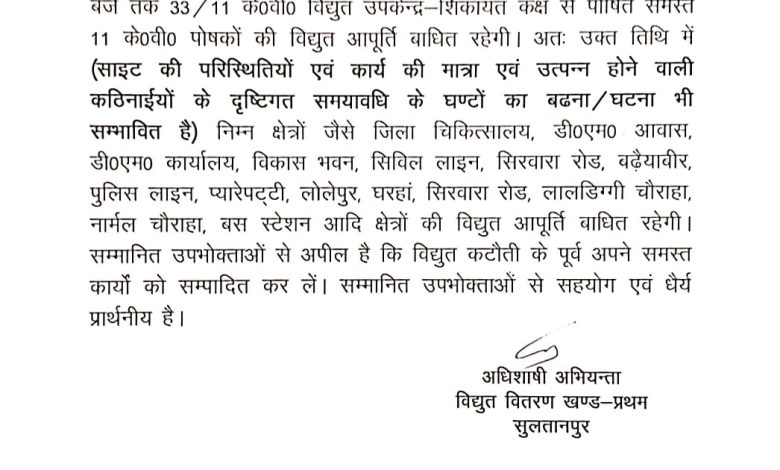 सुल्तानपुर-विधुत महकमें में तारो के नीचे गार्डिंग का काम हो रहा है शुरू,सुरक्षा व्यवस्था के मद्देनजर आगामी 12 -2-2023 फरवरी की रात्रि 11 बजे से सुबह 5 बजे तक विधुत सप्लाई होगी बन्द,33 केवी शिकायत कक्ष के विधुत तारो के नीचे गार्डिंग का होना है काम *जिला चिकित्सालय,डीएम आवास/डीएम आफिस,विकास भवन,सिविल लाइन,सिरवारा रोड, बढ़ैयावीर,पुलिस लाइन,प्यारे पट्टी,लोलेपुर,घरहा,लाल डिग्गी चौराहा,नार्मल चौराहा,बस स्टेशन सहित आदि शहरी क्षेत्रों में विधुत आपूर्ति रहेगी बाधित,विधुत महकमे ने इस दौरान विधुत उपभोक्ताओं से अपील की है कि अपना विधुत सम्बन्धी काम कटौती के निर्धारित समय के पहले कर ले पूरा,अधिशाषी अभियंता विधुत वितरण खण्ड प्रथम ने पत्र जारी कर दी जानकारी।