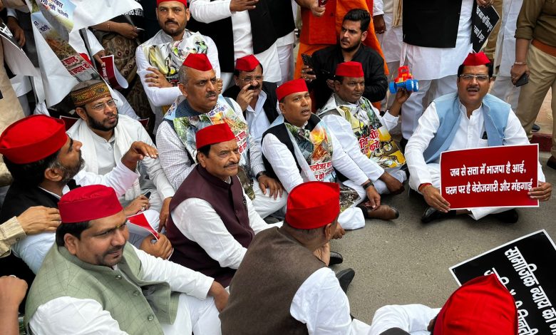 लखनऊ, उत्तर प्रदेश विधानसभा बजट सत्र शुरू होने से पूर्व समाजवादी पार्टी कार्यकर्ताओं एवं विधायकों द्वारा जोरदार विरोध प्रदर्शन सुरक्षाकर्मियों से सपा नेताओं की धींगा मस्ती धरने पर बैठे समाजवादी पार्टी के विधायक,