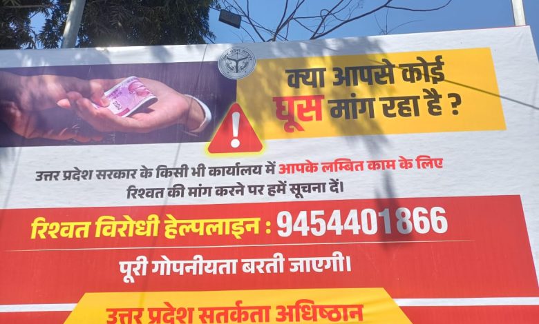 घूसखोरी रोकने के लिए उत्तर प्रदेश सरकार की ओर से लखनऊ कैसरबाग बस अड्डे के परिषर मे ये विज्ञापन