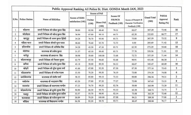 *आम जनमानस द्वारा वोटिंग के माध्यम से की गई सराहना में थाना कोतवाली मनकापुर को प्रथम स्थान, थाना उमरीबेगमगंज को द्वितीय, थाना कटराबाजार तृतीय स्थान, थाना कौडिया को चतुर्थ स्थान व थाना खोड़ारे को पाँचवा स्थान प्राप्त कर टाप 05 में स्थान प्राप्त किया।