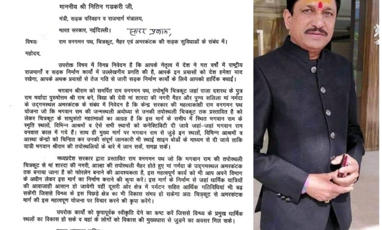 राम वनगमन पथ, चित्रकूट, मैहर एवं अमरकंटक की सड़क सुविधाओं के संबंध में केंद्रीय परिवहन मंत्री नितिन गडगरी को लिखा मैहर विधायक नारायण त्रिपाठी ने पत्र