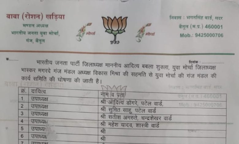 बैतूल। भास्कर मगरदे गंज मंडल अध्यक्ष युवा विकास मिश्रा की सहमति से युवा मोर्चा की गंज मंडल की कार्य समिति की घोषणा की जाती है।