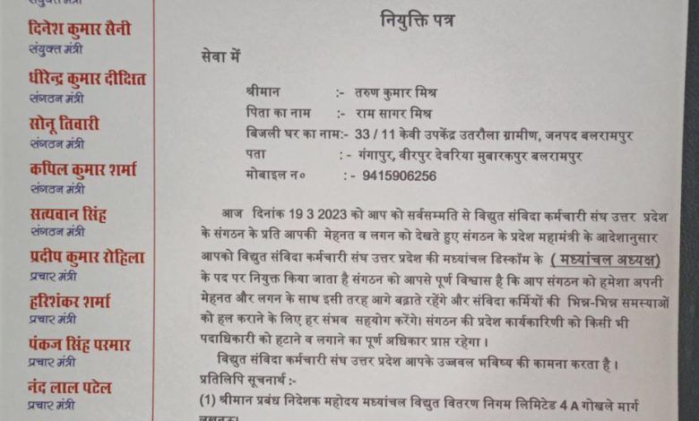 बलरामपुर: विद्युत विभाग और संविदा विद्युत कर्मचारी संघ के प्रति निष्ठा और ईमानदारी को देखते हुए तरुण कुमार मिश्रा (संविदा कर्मी उत्तर प्रदेश, उपकेन्द्र उतरौला ग्रामीण विद्युत खंड बलरामपुर ) को विद्युत संविदा कर्मचारी संघ उत्तर प्रदेश कि मध्यांचल डिस्कॉम के मध्यांचल अध्यक्ष के पद पर संगठन के महामंत्री आदेशानुसार नियुक्त किया गया | संगठन के पदाधिकारी एवं अन्य सदस्यों ने आशा जताई कि नवनियुक्त मध्यांचल अध्यक्ष संगठन के प्रति दी गई नई जिम्मेदारियों को पूरे लगन से निभाएंगे एवं संगठन को हमेशा आगे बढ़ाने के लिए तत्पर रहेंगे | इस मौके पर मोहम्मद काशिफ (प्रदेश अध्यक्ष), दिनेश कुमार(प्रदेश उपाध्यक्ष), रियाजुद्दीन(प्रदेश उपाध्यक्ष), अनिल कुमार (प्रदेश कोषाध्यक्ष), रामभूल सैनी(प्रदेश महामंत्री) एवं अन्य लोग संगठन के उपस्थित रहे |