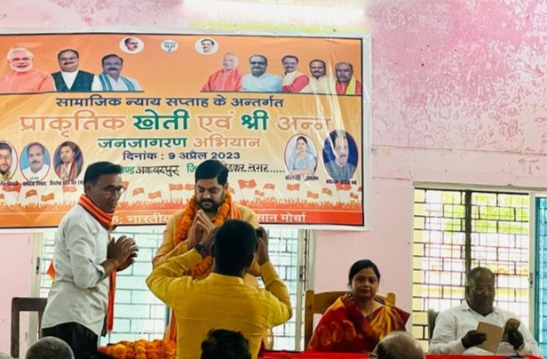 अंबेडकर नगर ÷ भारतीय जनता पार्टी के निर्देशानुसार सामाजिक न्याय सप्ताह के अंतर्गत रविवार को भाजपा किसान मोर्चा द्वारा विभिन्न विकास खंडों में मोटा अनाज एवम प्राकृतिक खेती के विषय पर किसान गोष्ठी संपन्न हुई।विकास खण्ड अकबरपुर में आयोजित कार्यक्रम में मुख्य अतिथि भाजपा जिलाध्यक्ष डॉ मिथिलेश त्रिपाठी ने कहा कि मोटा अनाज हमारे स्वास्थ्य के लिए बहुत लाभप्रद है।मोटे अनाज की उत्पत्ति से हमें अन्य फसल की अपेक्षा अधिक आय प्राप्त हो सकता है।मोटे अनाज की पैदावार और उसके उपयोग के बारे में प्रधान मंत्री नरेंद्र जी देश की जनता से अनुरोध विभिन्न अवसरों पर करते रहते हैं।
