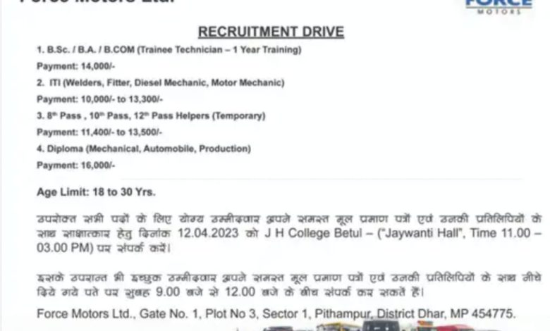 फोर्स मोटर्स भर्ती अभियान में बीएससी, बीए, बीकॉम के लिए प्रशिक्षु तकनीशियन-1 वर्ष का प्रशिक्षण भुगतान 14 हजार, आईटीआई वेल्डर, फिटर, डीजल मैकेनिक, मोटर मैकेनिक भुगतान: 10 हजार से 13 हजार 300, 8वीं पास 10वीं पास, 12वीं पास हेल्पर (अस्थायी) भुगतान 11 हजार 400 से 13 हजार 500, डिप्लोमा (मैकेनिकल, ऑटोमोबाइल, प्रोडक्शन) भुगतान: 16 हजार। उपरोक्त सभी पदों के लिए योग्य उम्मीदवार अपने समस्त मूल प्रमाण पत्रों एवं उनकी प्रतिलिपियों के साथ साक्षात्कार के लिए जयवंती हाल में 11 से 3 बजे तक संपर्क कर सकते हैं। कंपनी के अधिकारियों ने अपने समस्त