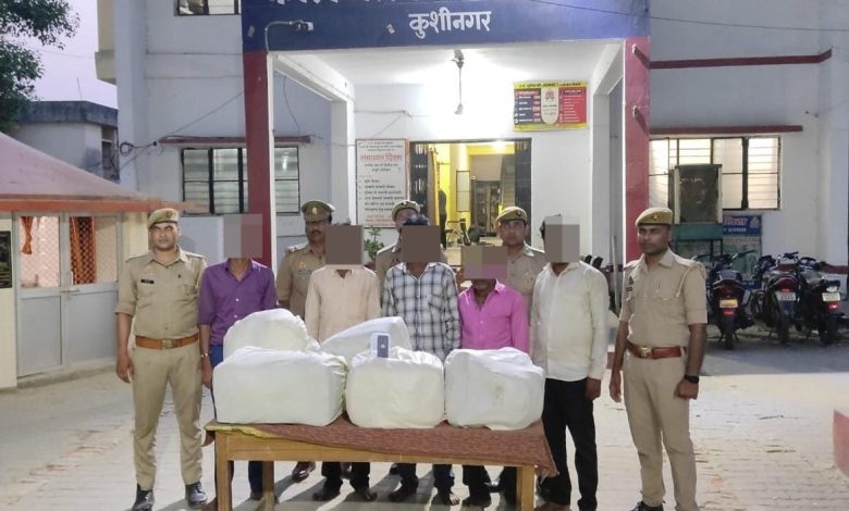 कुशीनगर 05 नफर अंतर्राज्यीय गांजा तस्कर गिरफ्तार, कुल 50 किग्रा0 अवैध गांजा ( कुल कीमत लगभग 10,00,000/- रु0) व जामा तलाशी से एक अदद की पैड मोबाईल तथा नगद 1250/- रु0 बरामद- पुलिस अधीक्षक कुशीनगर श्री धवल जायसवाल के निर्देशन, अपर पुलिस अधीक्षक कुशीनगर श्री रितेश कुमार सिंह के पर्यवेक्षण व क्षेत्राधिकारी सदर श्री उमेश चन्द भट्ट के नेतृत्व में अवैध मादक/द्रव्य पदार्थों की निष्कर्षण/परिवहन/बिक्री के विरूद्ध चलाये जा रहे अभियान के क्रम में थाना कोतवाली पडरौना व स्वाट की संयुक्त पुलिस टीम द्वारा बहद सिघापट्टी प्राईमरी स्कूल के पास से 05 नफर अभियुक्तों 01. अनिल गौड पुत्र रमाशंकर गौड निवासी रूपहीटाड़ थाना भितहां जिला पं0 चम्पारण बिहार, 02. प्रभु निषाद पुत्र स्व0 श्रीचन्द्र निषाद निवासी रूपहीटाड़ थाना भितहां जिला पं0 चम्पारण बिहार, 03. रूपेश पटेल पुत्र स्व0 इन्द्रासन निवासी कठार थाना धनहां जिला पं0 चम्पारण बिहार, 04. जिउत राम पुत्र स्व0 महादेव राम निवासी वन्शी टोला थाना धनहां जिला पं0 चम्पारण बिहार, 05. हरेश राम पुत्र नमी राम निवासी वन्शी टोला थाना धनहां जिला पं0 चम्पारण बिहार गिरफ्तार को गिरफ्तार कर प्रत्येक के कब्जे से झोले में 10-10 किग्रा0 कुल 50 कि0ग्रा0 अवैध गांजा ( कुल कीमत लगभग 10,00,000/- रु0) व जामा तलाशी से एक अदद की पैड मोबाईल तथा नगद 1250/- रू0 बरामद किया गया। बरामदगी व गिरफ्तारी के आधार पर थाना स्थानीय पर मु0अ0सं0 361/2023 धारा 8/20 NDPS Act में अभियोग पंजीकृत कर आवश्यक अग्रिम विधिक कार्यवाही की जा रही है पंजीकृत अभियोग-
