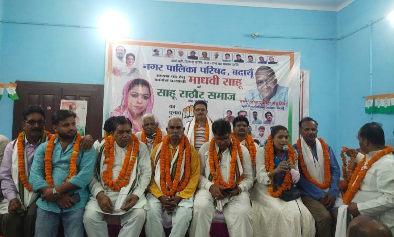 आज कांग्रेस नगर पालिका परिषद बदायूं प्रत्याशी माधवी साहू के चुनाव कार्यालय पर शहर कांग्रेस अध्यक्ष चौधरी बफाती मियां एवं जिलाध्यक्ष ओमकार सिंह की उपस्थिति में साहू राठौर समाज की अहम बैठक हुई, जिसमें मुख्य अतिथि पूर्व चेयरमैन स्व ओमप्रकाश माथुरिया के भाई आनंद माथुरिया एवं बिशिष्ट अतिथि परिवर्तन समाज पार्टी के युवा राष्ट्रीय अध्यक्ष मुकेश राठौर रहे। मुख्य अतिथि आनंद माथुरिया ने समाज से आवाह्न किया कि साहू समाज के साथियों हमें ग्यारह मई को धोखेबाज पार्टी भाजपा प्रत्याशी एवं हमारे नेता स्व ओमप्रकाश माथुरिया जी भर भर पेट कोसने वाली दीपमाला गोयल को हराना है, हमारे समाज की प्रत्याशी माधवी साहू को जिताना है।
