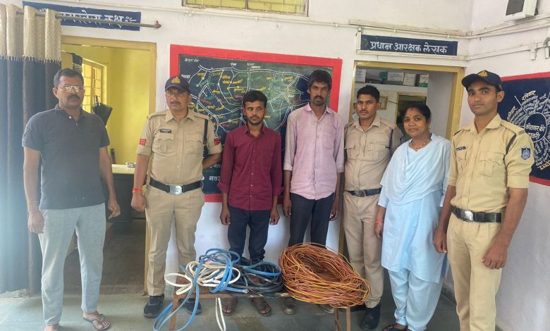 श्रीमान पुलिस अधीक्षक महोदय बैतूल श्री सिध्दार्थ चौधरी, अतिरिक्त पुलिस अधीक्षक महोदय बैतूल श्री नीरज सोनी, श्रीमान एसडीओपी महोदय बैतूल सुश्री सृष्टि भार्गव के मार्गदर्शन पर थाना प्रभारी साईखेडा एवं पुलिस स्टाफ के द्वारा सीसीटीवी फुटेज के आधार पर दबिश देकर दो आरोपीगण गजानंद पिता मूंगा पाटनकर उम्र 32 साल निवासी ग्राम गौला एवं भाऊराव पिता दौलतराव लोखंडे उम्र 37 साल निवासी ग्राम गौला थाना साईखेडा को घेराबंदी कर हिरासत में लिया गया। आरोपियो द्वारा चोरी किये गये केवल वायर करीबन 100 फीट तथा बिजली के एल्यूमिनियम तार करीबन 675 फीट लंबा एवं चोरी मे उपयोग की गयी मोटर साईकिल जप्त की गयी है चोरी गये केवल एवं वायरो की कीमत करीबन 10,000 रूपये है। आरोपियो को गिरफ्तार कर माननीय न्यायालय पेश किया है।