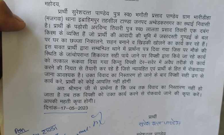 अंबेडकरनगर। मामला इब्राहिमपुर थाने के अंतर्गत भारीडीहां गांव का है जहां पर आबादी की जमीन में अवैध कब्जा को रोकने के लिए एक पक्ष के द्वारा इब्राहिमपुर थाने में प्रार्थना पत्र दिया जाता है। सूत्रों से मिली जानकारी के अनुसार हल्का सिपाही के द्वारा तत्काल काम रुकवा दिया जाता है तथा दोनों पक्ष को इब्राहिमपुर थाने आने को कहा जाता है जहां पर इब्राहिमपुर पुलिस पर एक गंभीर आरोप लग रहा है प्रथम पक्ष का कहना है कि हल्का सिपाही गुलाब पांडे के द्वारा जबरदस्ती दबाव बनाया जा रहा है और मुकदमा लिखने की धमकी दिया जा रहा है कि अगर निर्माण नहीं करने देंगे तो आप के खिलाफ मुकदमा लिख कर जेल भेज दिया जाएगा। एक तरफ जहां सरकार कह रही है कि सबका साथ सबका विकास होना चाहिए वही इब्राहिमपुर पुलिस के कुछ कारनामे और ही बता रहे हैं समझौता के नाम पर जबरदस्ती करना न्याय संगत नहीं है प्रथम पक्ष के द्वारा ठाणे से न्याय न मिलने के कारण जिला अधिकारी महोदय के यहां प्रार्थना पत्र देकर अपनी समस्या बताई है
