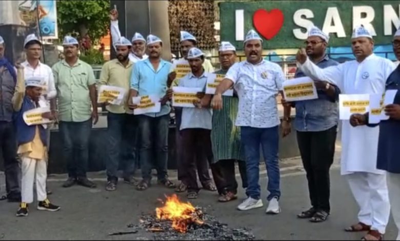 आम आदमी पार्टी सारणी जय स्तंभ चौक पर कृषि मंत्री कमल पटेल का पुतला दहन किया गया।